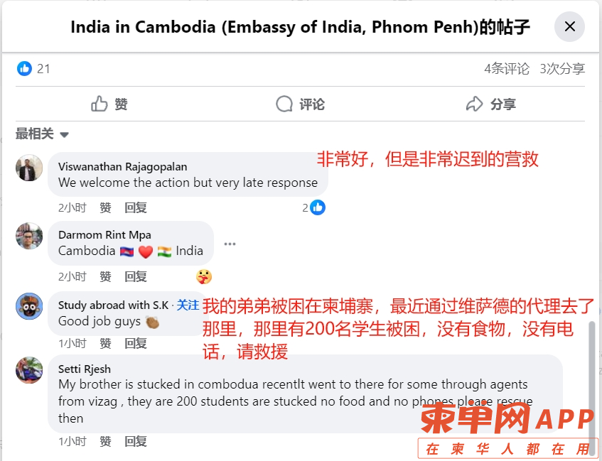 柬埔寨当局从金贝4撤离数名印度公民,已于20日晚与印度使馆取得联系并得到必要的支持